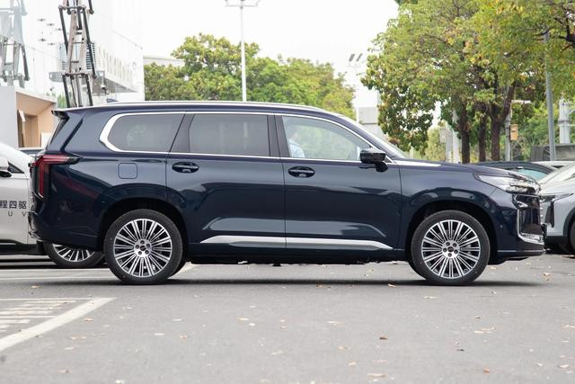 下方两侧还配备了回旋镖样式的银色装饰件,并且还有垂直样式的雾灯,整个车头看起来比较大气稳重。车身侧面同样也是如此,作为中大型SUV,整体设计走的是实用居家的风格。车顶上方的线条比较平直,显然也是照顾到了第三排的头部空间,配备的20英寸多幅式轮毂看起来也比较有档次。车窗周围以及车门下方都加入了大面积银色饰条进行修饰,车顶配备了行李架,而且采用传统机械式门把手。
